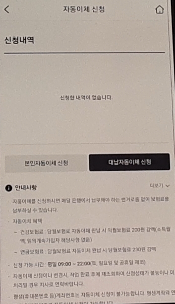 The건강보험 어플로 자동이체를 신청가능한 경우는 평일 오전 9시~밤 10시까지입니다.